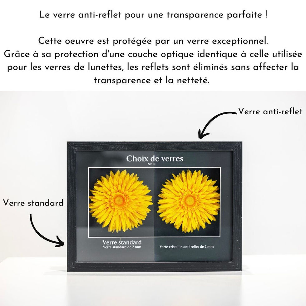 Nous vous proposons d'acquérir cette oeuvre déjà encadrée avec soin par notre atelier. L'oeuvre est valorisée par un montage flottant et de conservation musée, l'ensemble est protégée par un verre anti-reflets à 70 %. Un système d’accrochage est fixé au dos permettant une fixation murale en toute sécurité.
